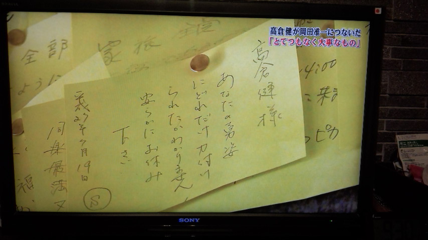 でも、そのときの私の付箋がでかでかとテレビ画面に映ったのです。そのとき、なんだか自分の思いが健さんに届いたような気持ちがしました。あの付箋が私のものだとは私でなければわからなかったでしょう。私がいつものように「24時間テレビなんてさ~」とこの番組を見なかったら、誰もこのことを知ることなく終わっていたはずです。だから、テレビ画面に私の付箋が出てきたとき、私の思いが健さんに届いたような気持ちがしました。もちろん健さんには会ったこともありませんし、健さんは私の存在すら知らないのですが、今回のハプニングは「人知れず頑張っている人が好きな健さん」が私を励ましてくれたように感じられてとてもうれしかったです。
